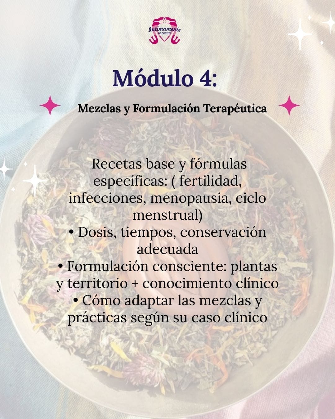 No se trata solo de seguir recetas, sino de comprender cómo formular mezclas terapéuticas que respondan a lo que cada mujer necesita. Veremos fórmulas específicas para momentos como la fertilidad, las infecciones, la menopausia o los dolores menstruales, y aprenderás a adaptarlas según cada historia personal.